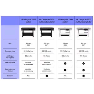 Imprimanta HP DesignJet T950 este disponibilă în 2 versiuni diferite. Practic este același plotter, dar diferența dintre "Standard" și "MFP" constă în funcția de scanner integrată.